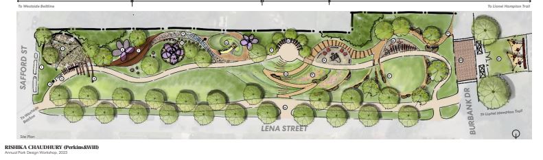 We knew we wanted to include play spaces, incorporate music as an ode to Lionel Hampton, honor the history of Hunter Hills, and make it an inviting, colorful place to stop for rest, play or to congregate. But we did have obstacles. The MARTA tunnel runs below the park which prohibits any large, weighty structures or trees from being installed above the tunnel. The final park design was completed and incorporates several sensory interactive areas at the ridge of the park, a zig zag path through the center of the park to easily traverse the hill, gardens, various seating/climbing structures, a potential dog park across from the park on Burbank, and easier access from the curbs to the park.