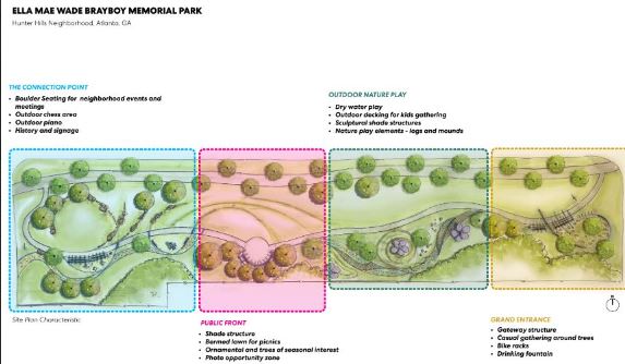 Ella Mae Wade Brayboy Park a/k/a Brayboy Park is located on the East side of Hunter Hills, in the Lionel Hampton Trail segment. The park borders along Burbank Drive NW, Lena Street, and Stafford Street NW. Brayboy Park was opened in April 2019, and it was dedicated by C.M. Michael Julian Bond to Ms. Brayboy, the "Godmother of Voter Registration." Ms. Brayboy lived on Chappell Road NW in Hunter Hills and was one the most engaged community activists in the City of Atlanta. As one of the Georgia's first Black voter registrars in Georgia in the 1960's, she registered over 10, 000 voters between the 60's and 70's. Her activism was wide and lifelong.