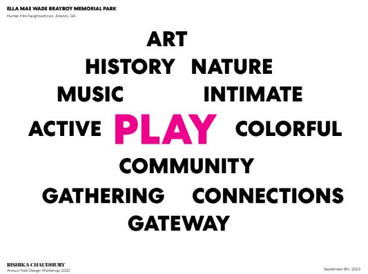 Friends of Brayboy Park was paired with Ms. Rishika Chaudhury of Perkins&Will design firm. A neighborhood call was put out to form a Brayboy Park Planning Committee. Together we met with Rishika, attended the 2023 Roundtable, Inclusive Play Spaces featuring Meghan Talarowski, brainstormed ideas, and held a final Park Planning workshop in October at Brayboy Park.